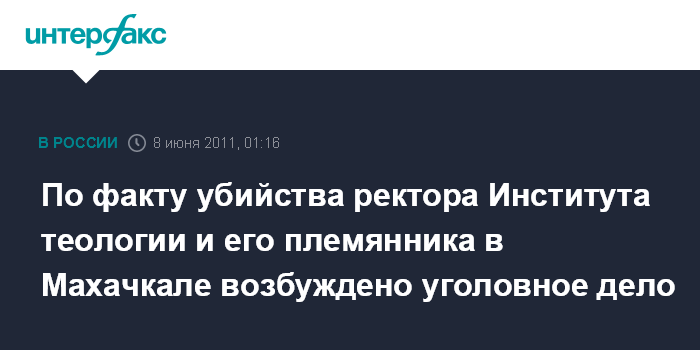 Махачкала. 8 июня. ИНТЕРФАКС-ЮГ - Следственные органы возбудили уголовное дело по факту произошедшего в Махачкале во вторник убийства ректора Института теологии Максуда Садикова и его племянника Залимхана Мусаева, сообщил представитель СУ СКР по Дагестану.