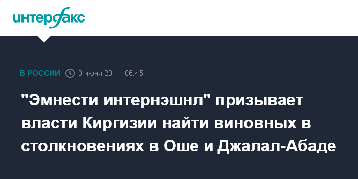 Лондон. 8 июня. ИНТЕРФАКС - Новые межнациональные столкновения могут произойти в Киргизии, если власти не найдут и не накажут виновных в событиях июня 2010 года в Оше и Джалал-Абаде, говорится в докладе правозащитной организации "Эмнести интернэшнл".