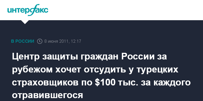 Москва. 8 июня. INTERFAX.RU - Центр защиты граждан России за рубежом планирует добиться от турецких страховых компаний выплат пострадавшим от отравления россиянам в размере как минимум $100 тыс. на каждого, сообщил на заседании Общественной палаты в Москве руководитель Центра Дмитрий Давыденко.