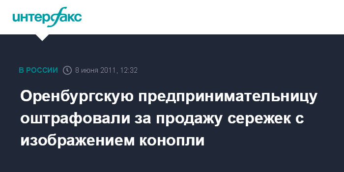 Оренбург. 8 июня. INTERFAX.RU - Ленинский районный суд Оренбурга назначил индивидуальной предпринимательнице штраф в 40 тыс. рублей за торговлю серьгами с изображением конопли.