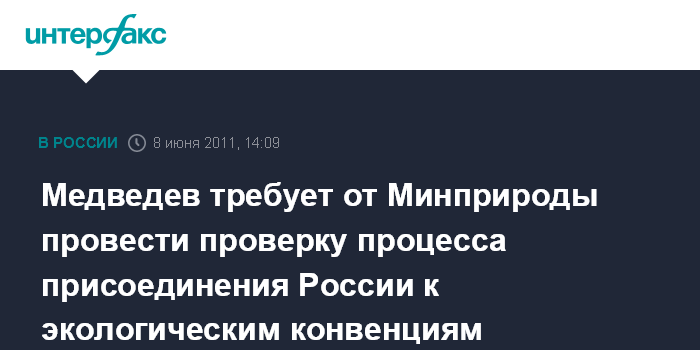 Москва. 8 июня. INTERFAX.RU - Президент РФ Дмитрий Медведев поручил главе Минприроды Юрия Трутневу проверить, как идет процесс присоединения России к международным конвенциям в сфере экологии.