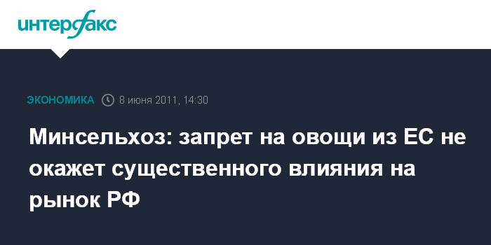 Москва. 8 июня. INTERFAX.RU - Введение временного запрета на поставки овощей из Евросоюза не окажет существенного влияния на ситуацию на внутреннем рынке, считают в Минсельхозе РФ.