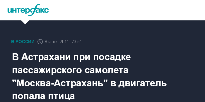 Ростов-на-Дону. 8 июня. ИНТЕРФАКС-ЮГ - Попадание птицы в один из двигателей зафиксировано во время посадки пассажирского "Боинга", следовавшего из Москвы в Астрахань, сообщили агентству "Интерфакс-Юг" в правоохранительных органах Астраханской области.
