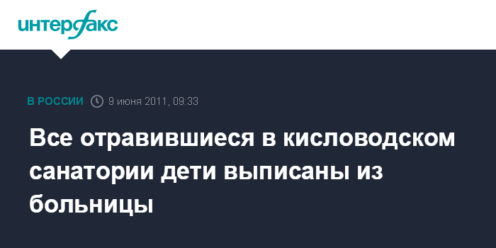 Пятигорск. 9 июня. INTERFAX.RU - Из инфекционной больницы Кисловодска (Ставропольский край) выписан последний ребенок, госпитализированный после отравления в санатории "Сосновая роща", сообщили агентству "Интерфакс-Юг" в пресс-службе горадминистрации.