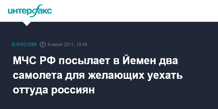 Москва. 9 июня. INTERFAX.RU - Два самолета МЧС РФ в пятницу вылетят в Йемен за россиянами, желающими покинуть эту страну, сообщили "Интерфаксу" в управлении информации МЧС РФ.