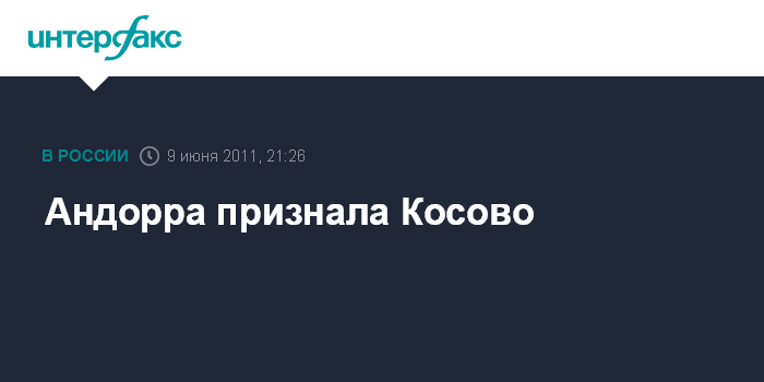 Белград. 9 июня. INTERFAX.RU - Власти Андорры признали независимость Косово, говорится в распространенном в четверг заявлении министерства иностранных дел этого сербского края, в одностороннем порядке объявившем независимость.