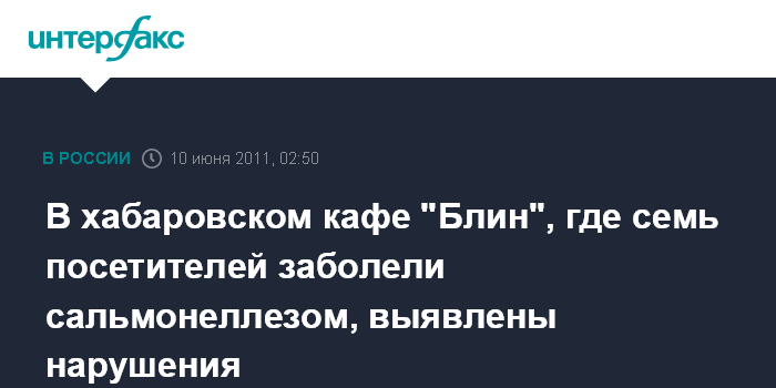 Хабаровск. 10 июня. ИНТЕРФАКС-ДАЛЬНИЙ ВОСТОК - Нарушения санитарных правил выявлены в кафе "Блин", принадлежащем ООО "ФРГ" в Хабаровске, где семь человек заболели сальмонеллезом после посещения заведения.