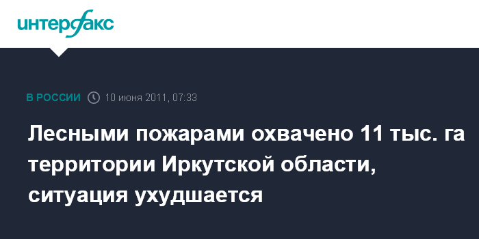 Иркутск. 10 июня. ИНТЕРФАКС-СИБИРСК - Площадь территории Иркутской области, охваченной лесными пожарами на сегодняшний день, достигла 11 тыс. га, сообщил первый зампредседателя правительства Иркутской области Владимир Пашков.