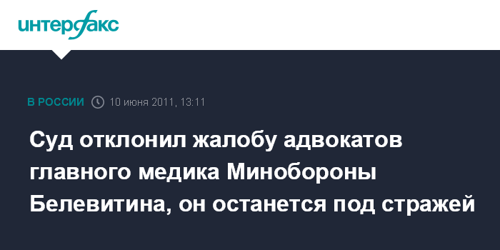 Москва. 10 июня. INTERFAX.RU - Московский окружной военный суд (МОВС) оставил под стражей главного медика Минобороны РФ генерал-майора Александра Белевитина, обвиняемого в получении взятки в размере 4,7 млн рублей.
