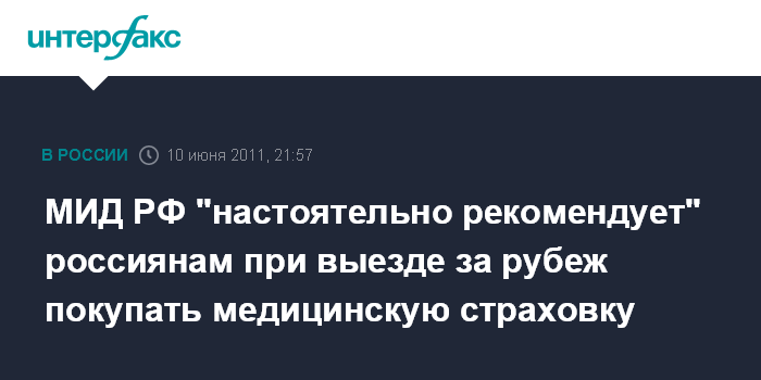 "МИД России настоятельно рекомендует российским гражданам при планировании выездов за рубеж, в том числе в страны, имеющие с Российской Федерацией соглашения об упрощенных или безвизовых поездках, заранее позаботиться о собственной страховой защите, то есть приобрести медицинский полис страхования", - говорится в сообщении, опубликованном на сайте внешнеполитического ведомства России в пятницу.