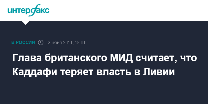 Лондон. 12 июня. INTERFAX.RU - Режим ливийского лидера Муамара Каддафи с каждым днем ослабевает, заявил глава МИД Великобритании Уильям Хейг. "Время на нашей стороне, а не на его (М.Каддафи - ИФ). Власть М.Каддафи ослабевает с каждым днем. Он проигрывает важные сражения. Мы должны проявить терпение и упорство, чтобы прийти к успеху", - сказал министр.