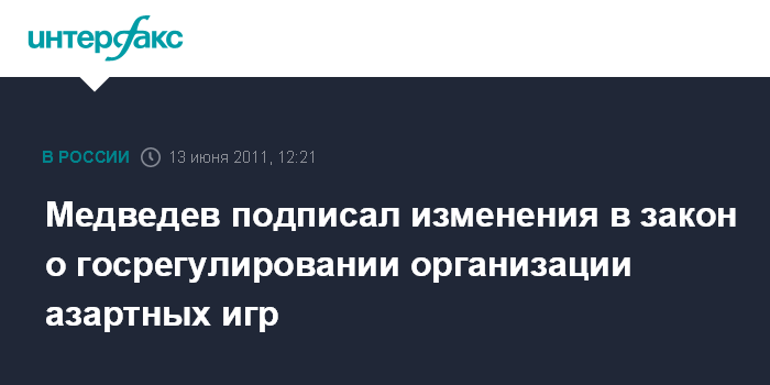 Москва. 13 июня. INTERFAX.RU - Президент России Дмитрий Медведев подписал федеральный закон "О внесении изменений в федеральный закон "О государственном регулировании деятельности по организации и проведению азартных игр и о внесении изменений в некоторые законодательные акты Российской Федерации", сообщает в понедельник пресс-служба Кремля. Данный закон был принят Госдумой 1 июня 2011 года и одобрен Советом Федерации 8 июня.