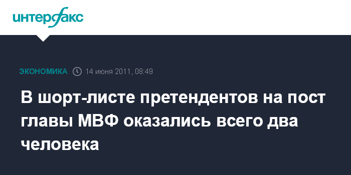 Вашингтон. 14 июня. INTERFAX.RU - Совет директоров Международного валютного фонда (МВФ) сократил число претендентов на пост главы организации до двух кандидатур. Борьбу за назначение в качестве директора-распорядителя фонда продолжат министр финансов Франции Кристин Лагард и руководитель Центробанка Мексики Аугустин Карстенс, передает BBC.