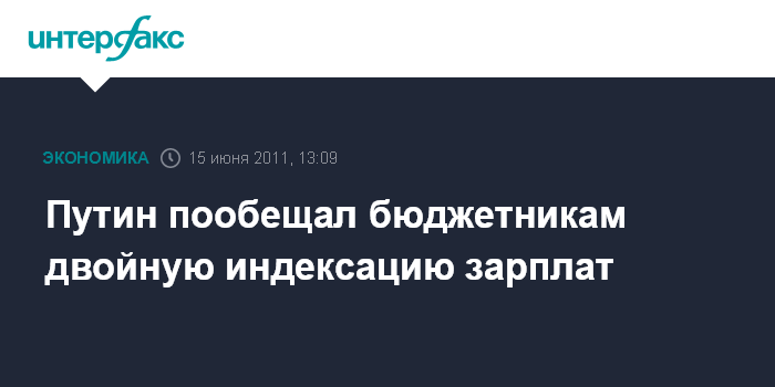 Женева. 15 июня. INTERFAX.RU - Премьер-министр РФ Владимир Путин обещает дважды проиндексировать зарплату бюджетников в текущем году.