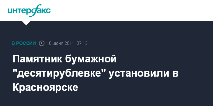 Красноярск. 16 июня. ИНТЕРФАКС-СИБИРЬ - Бронзовый памятник десятирублевой купюре, выпуск которой был прекращен, установили в Красноярске 16 июня, сообщает пресс-служба Восточно-Сибирского банка Сбербанка России в четверг.
