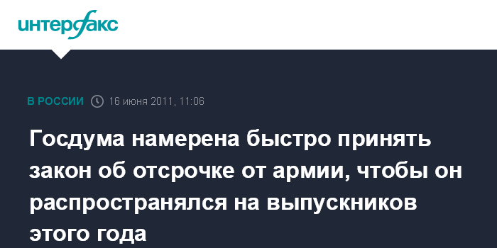 Москва.16 июня. INTERFAX.RU - Госдума в пятницу собирается принять во втором и сразу в третьем, окончательном чтении законопроект об отсрочке от армии для выпускников школ, которым исполнилось 18 лет, сообщил журналистам в четверг спикер Борис Грызлов.