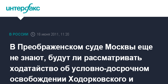 Москва. 16 июня. INTERFAX.RU - Преображенский суд Москвы еще не решил, будет ли рассматривать ходатайства об условно-досрочном освобождении бывшего главы НК "ЮКОС" Михаила Ходорковского и экс-руководителя МФО "МЕНАТЕП" Платона Лебедева.