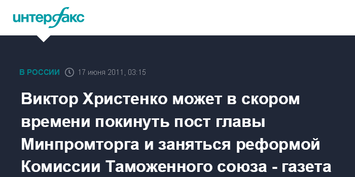 Москва. 17 июня. ИНТЕРФАКС - Министр промышленности и торговли Виктор Христенко станет отвечать за реформирование Комиссии Таможенного союза и будет вынужден покинуть пост главы ведомства через некоторое время.