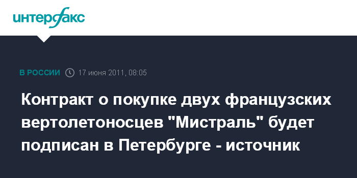 Москва. 17 июня. INTERFAX.RU - Россия и Франция, как ожидается, в рамках Петербургского экономического форума подпишут 17 июня контракт о закупке для ВМФ РФ двух французских десантно-вертолетных кораблей-доков "Мистраль", сообщил "Интерфаксу" источник во властных структурах.