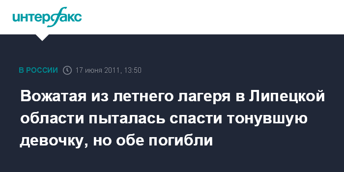 Москва. 17 июня. INTERFAX.RU - В реке Олымь в Липецкой области обнаружены тела 13-летней девочки из летнего оздоровительного лагеря и ее вожатой - 21-летней студентки педагогического института, сообщает в пятницу СК РФ.