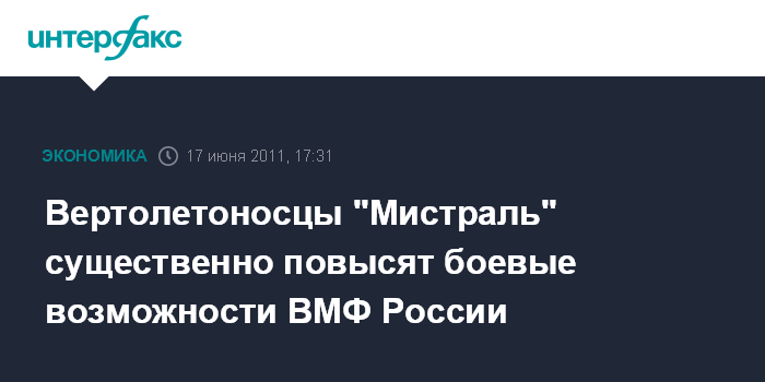 Москва. 17 июня. INTERFAX.RU - Наличие в боевом составе ВМФ России кораблей типа "Мистраль" позволит значительно повысить эффективность управления силами разнородных группировок ВМФ в составе межвидовых группировок в морских и океанских зонах, заявил главнокомандующий Военно-морским флотом адмирал Владимир Высоцкий.