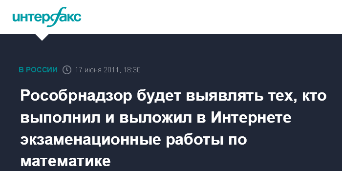 Москва. 17 июня. INTERFAX.RU - Рособрнадзор рассчитывает установить тех, кто помогал детям сдавать ЕГЭ по математике и выложил ответы в социальной сети в Интернете.