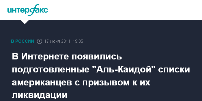 Вашингтон. 17 июня. INTERFAX.RU - На сайтах исламских радикалов, связанных с "Аль-Каидой", размещен список из 40 граждан США и призывы к их ликвидации, сообщает американский телеканал NBS.