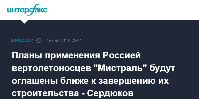 "Давайте мы сначала их построим, а потом уже будем думать, где его применять. У нас есть планы применения, чуть ближе к готовности (вертолетоносцев - "Интерфакс-АВН") мы их огласим", - сказал А.Сердюков.