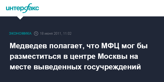 "Я считаю, что центр города, частично освобожденный от государственных учреждений, можно было бы передать для того, чтобы он использовался как место для офисов МФЦ", - заявил Д.Медведев, выступая на встрече в субботу с членами Международного консультативного совета по созданию Международного финансового центра в РФ.