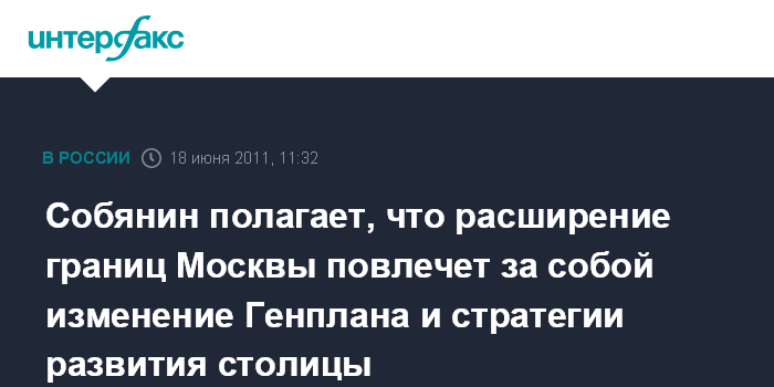 "Ваше решение о переносе правительственных учреждений и расширении границ города потребует серьезного осмысления и изменения Генерального плана и стратегии развития Москвы таким образом, чтобы он развивался более гармонично, чтобы не было все сосредоточено в историческом центре и не создавало коллапса транспортного и инфраструктурного развития города", - сказал С.Собянин на встрече президента РФ Дмитрия Медведева с членами Международного консультативного совета по созданию Международного финансового центра в РФ.