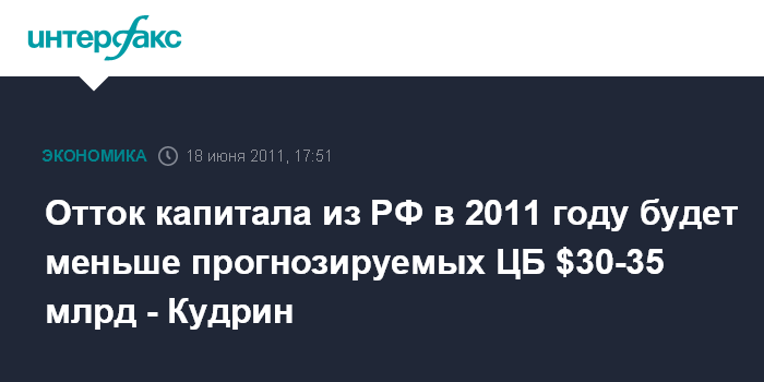 Отток капитала из РФ в 2011 году будет меньше прогнозируемых ЦБ $30-35 млрд - Кудрин