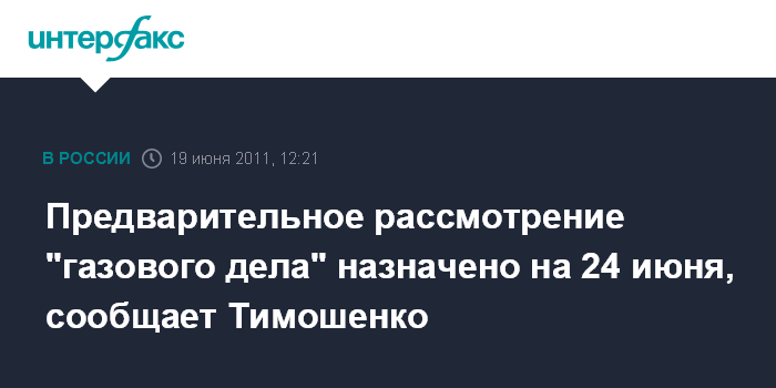 Киев. 19 июня. INTERFAX.RU - Печерский районный суд города Киева начнет предварительное рассмотрение "газового дела" в отношении бывшего премьер-министра Украины, лидера партии "Батькивщина" Юлии Тимошенко в пятницу, 24 июня. "Только что получила телеграмму. Янукович решил начать печерское судилище против меня немедленно - уже в пятницу (24 июня) в 9.00, по адресу: Крещатик, 42-А", - написала Ю.Тимошенко в своем микроблоге на Twitter.