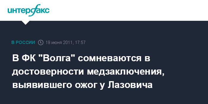 Москва. 19 июня. INTERFAX.RU - В нижегородском футбольном клубе "Волга" подвергли сомнению выводы медиков по поводу травмы футболиста петербургского "Зенита" Данко Лазовича. "На обследовании Лазовича в Питере увидели ожог под правой лопаткой, а на фото с места событий он держится за левый бок", - такая запись появилась на страничке ФК "Волга" в "Твиттере".
