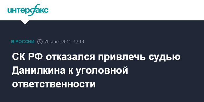 Москва. 20 июня. INTERFAX.RU - Следственный комитет РФ не стал возбуждать уголовное дело против председателя Хамовнического суда Москвы Виктора Данилкина, который вел второй процесс против экс-главы "ЮКОСа" Михаила Ходорковского и бывшего руководителя "МЕНАТЕПа" Платона Лебедева.