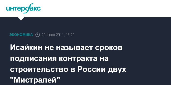 Бурже (Франция) .20 июня. INTERFAX.RU - Контракт на строительство по лицензии в России двух кораблей "Мистраль" будет заключен позже, сообщил в понедельник журналистам гендиректор Рособоронэкспорта Анатолий Исайкин.