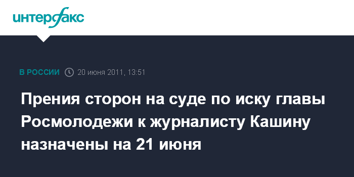 Прения сторон на суде по иску главы Росмолодежи к журналисту Кашину назначены на 21 июня