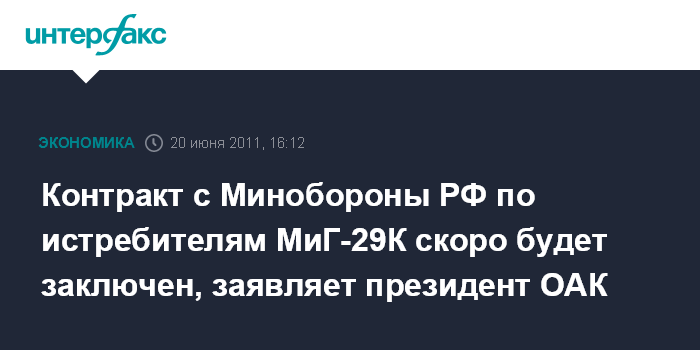 Бурже (Франция).20 июня. INTERFAX.RU - Объединенная авиастроительная корпорация (ОАК) в ближайшее время заключит контракт с Минобороны РФ на поставку корабельных истребителей МиГ-29К, сообщил в понедельник журналистам президент ОАК Михаил Погосян.
