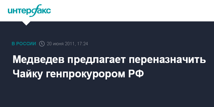 Москва. 20 июня. INTERFAX.RU - Президент России Дмитрий Медведев представил в Совет Федерации кандидатуру Юрия Чайки для назначения на должность генерального прокурора РФ, сообщила пресс-служба Кремля.