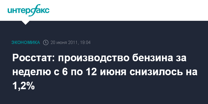 Москва. 20 июня. INTERFAX.RU - За неделю с 6 по 12 июня 2011 года в России произведено 735 тыс. тонн автомобильного бензина, или 98,8% к предыдущей неделе, сообщает Федеральная служба госстатистики.