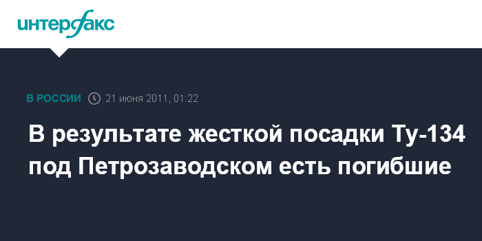 Москва. 21 июня. INTERFAX.RU - В результате жесткой посадки самолета Ту-134 , выполнявшего рейс "Москва-Петрозаводск", по предварительным данным, погибло несколько человек, сообщил "интерфаксу2 во вторник официальны представитель СК РФ Владимир Маркин
