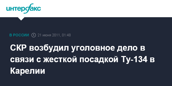 Москва. 21 июня. INTERFAX.RU - По факту жесткой посадки Ту-134 в Карелии возбуждено уголовное дело, сообщил "Интерфаксу" официальный представитель СК РФ Владимир Маркин.
