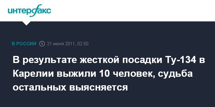 Москва. 21 июня. INTERFAX.RU - По предварительным данным, в результате жесткой посадки самолета ту-134 под Петрозаводском пострадали 10 человек, сообщили "Интерфаксу" в МЧС России.