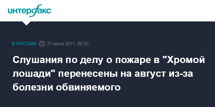 Пермь. 21 июня. INTERFAX.RU - Ленинский районный суд Перми вновь перенес слушание по делу о пожаре в клубе "Хромая лошадь" из-за болезни одного из обвиняемых - владельца клуба Анатолия Зака, передает корреспондент агентства "Интерфакс-Поволжье" из зала суда.
