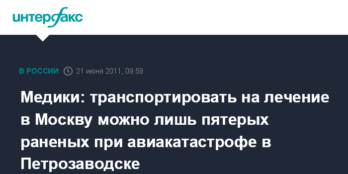 Москва. 21 июня. INTERFAX.RU - Врачи считают, что пока для лечения в Москву из Петрозаводска могут быть доставлены пятеро пострадавших в катастрофе самолета Ту-134 в Карелии.