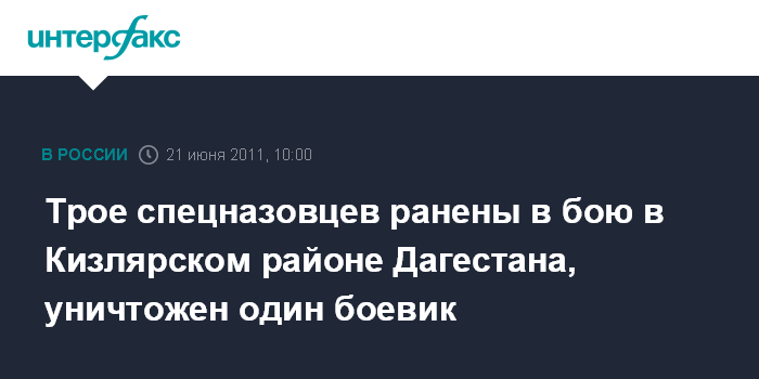 Москва. 21 июня. INTERFAX.RU - Трое сотрудников правоохранительных органов ранены в ходе боестолкновения с участниками НВФ в лесном массиве у села Кузнецовка в Кизлярском районе Дагестана.