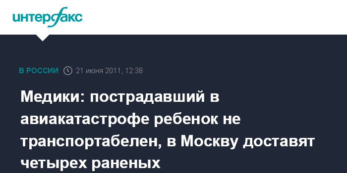 Москва. 21 июня. INTERFAX.RU - По медицинским показаниям девятилетний ребенок, пострадавший в результате катастрофы самолета ТУ-134 под Петрозаводском, не может быть транспортирован в Москву, сообщил руководитель Всероссийского центра медицины катастроф "Защита" Минздравсоцразвития Сергей Гончаров