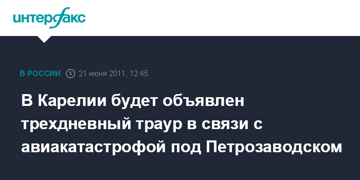 Петрозаводск. 21 июня. INTERFAX.RU - Среда, четверг и пятница станут в Карелии днями траура в связи с катастрофой Ту-134 под Петрозаводском, сообщили "Интерфаксу" в администрации республики.