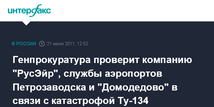 Генпрокуратура проверит компанию "РусЭйр", службы аэропортов Петрозаводска и "Домодедово" в связи с катастрофой Ту-134