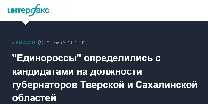 Москва. 21 июня. INTERFAX.RU - "Единая Россия" предложит президенту РФ Дмитрию Медведеву кандидатуры на должности губернаторов Тверской и Сахалинской области, в том числе нынешних руководителей этих регионов.