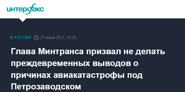Петрозаводск. 21 июня. INTERFAX.RU - Министр транспорта Игорь Левитин, который возглавил правительственную комиссию по расследованию причин катастрофы самолета Ту-134, призвал пока не делать выводов о причинах трагедии.